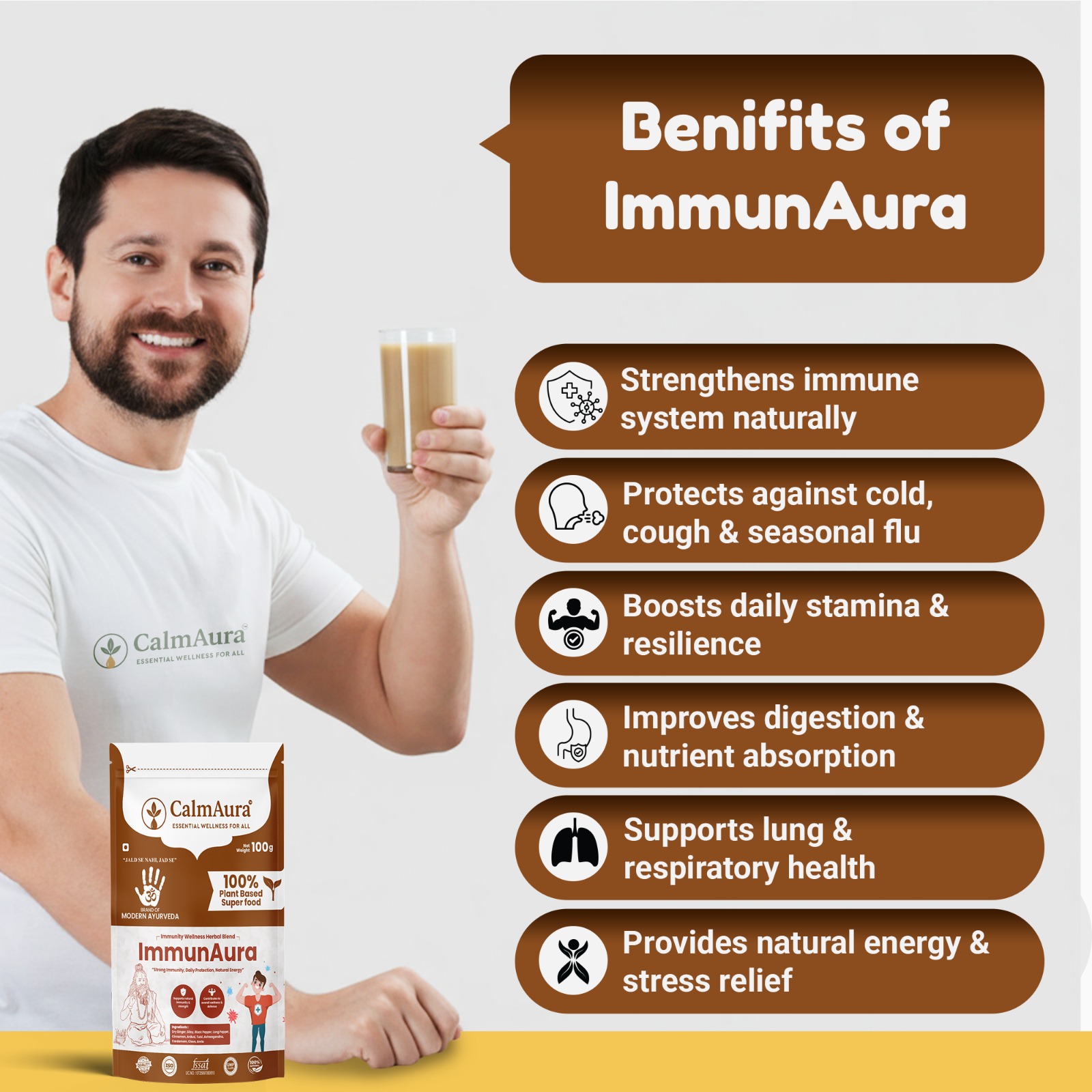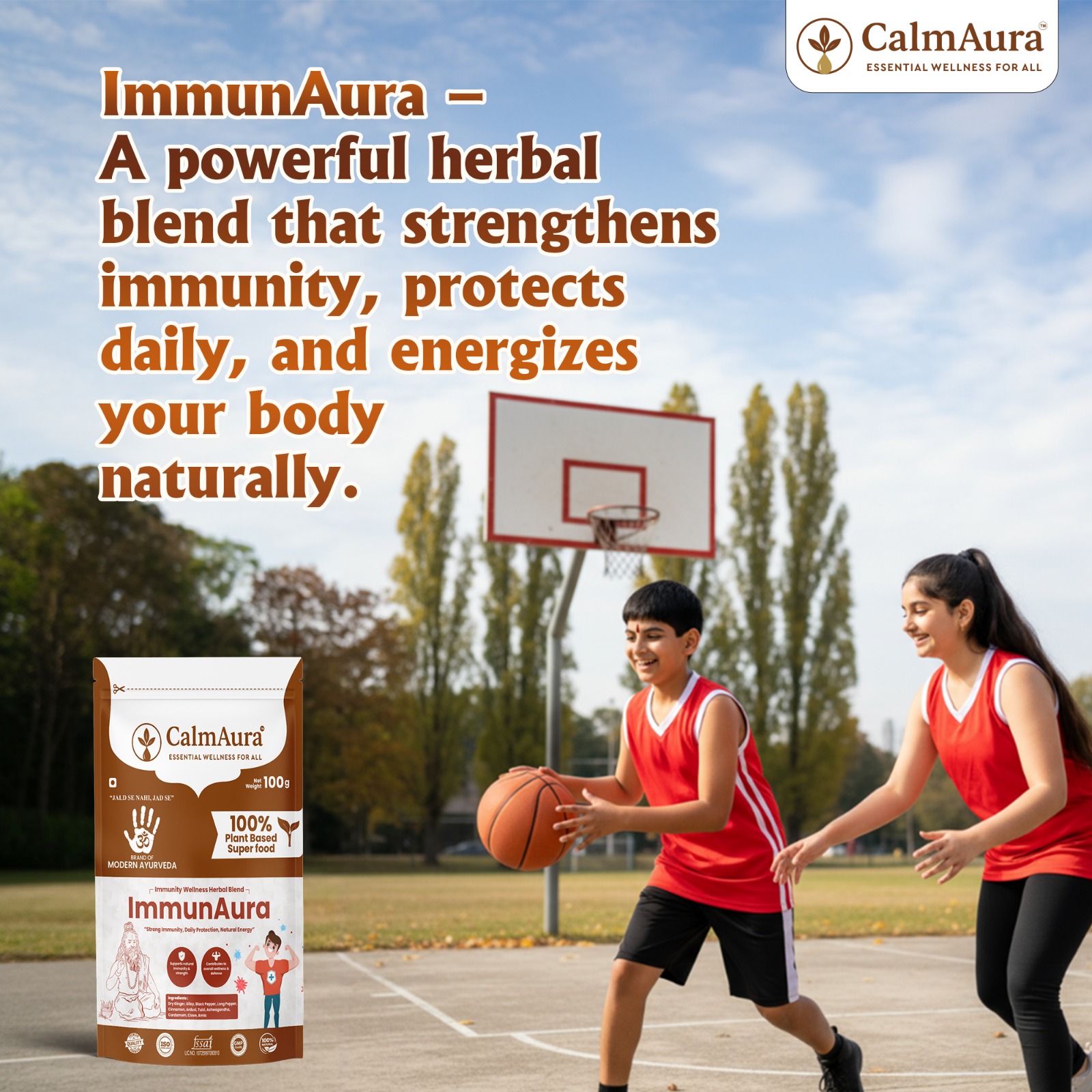 CalmAura ImmunAura is a powerful Ayurvedic formula crafted to strengthen immunity, protect from infections, and enhance daily energy.