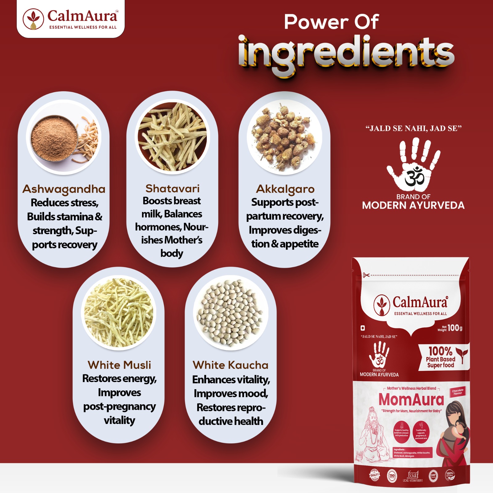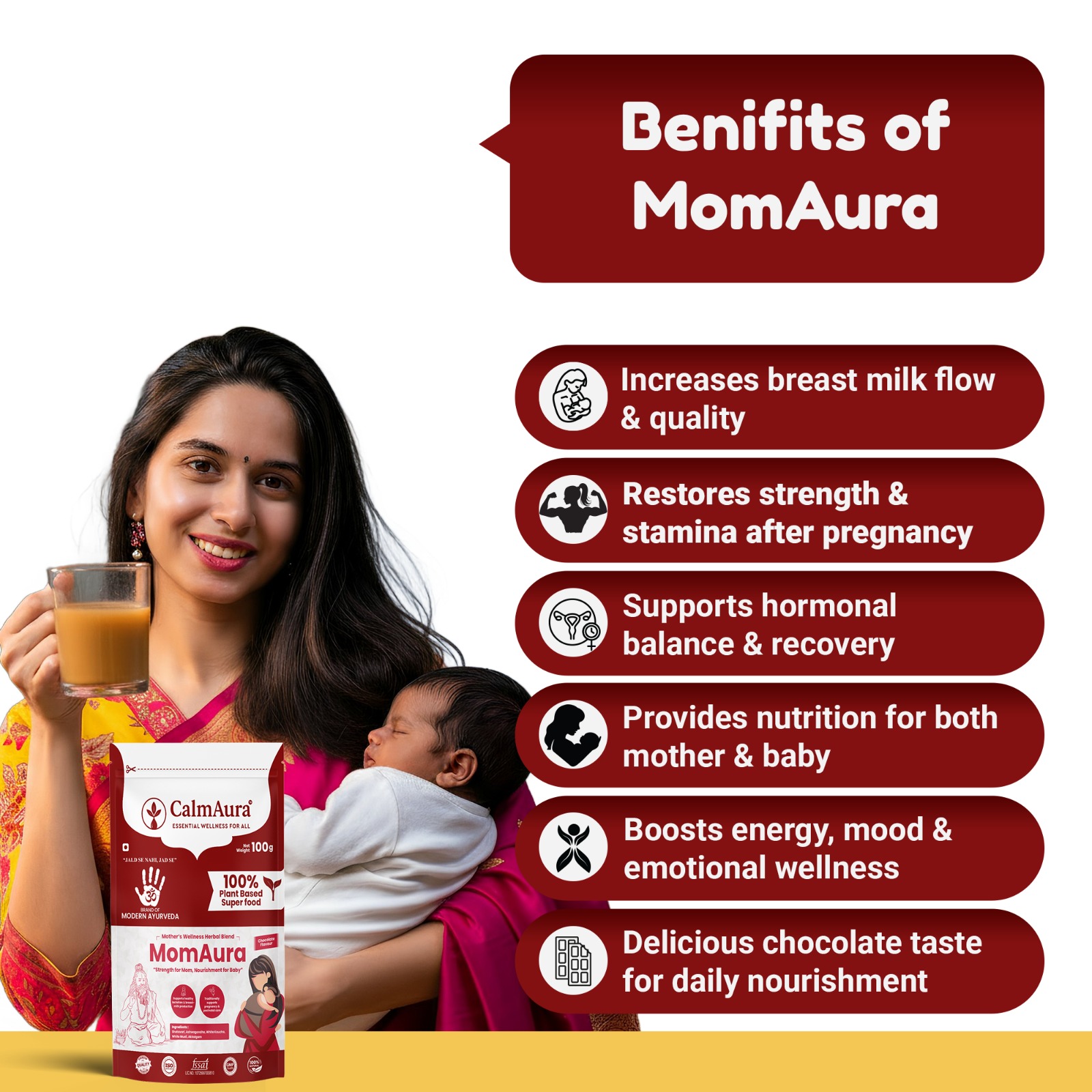 Enriched with Shatavari, Ashwagandha, White Musli, White Kaucha, and Akkalgaro, MomAura nourishes the mother’s body while improving breast milk flow and quality for the baby’s healthy growth.