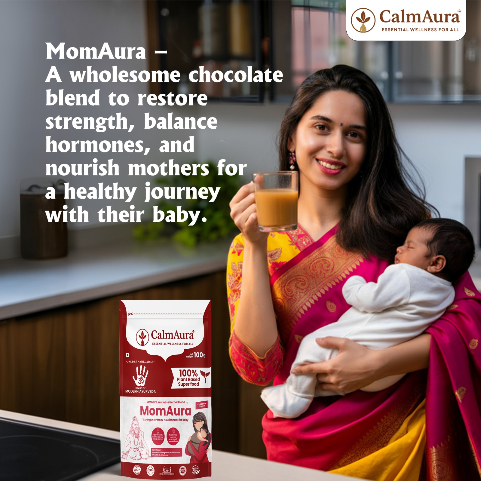 CalmAura MomAura is a premium Ayurvedic wellness blend formulated specially for new mothers to restore strength, vitality, and inner balance after childbirth.