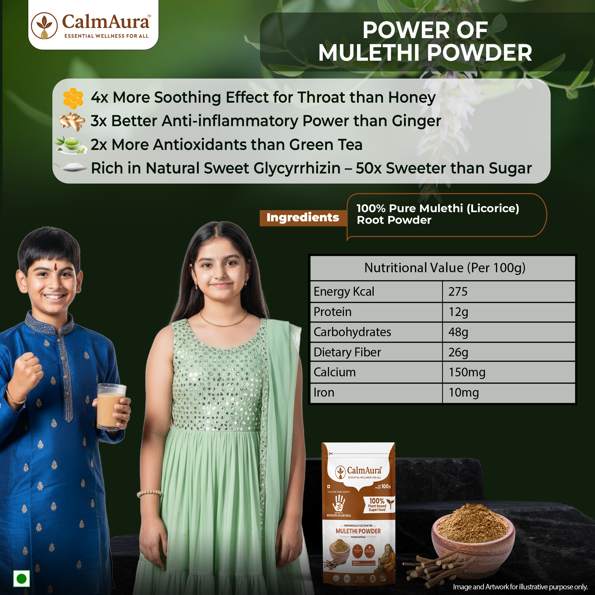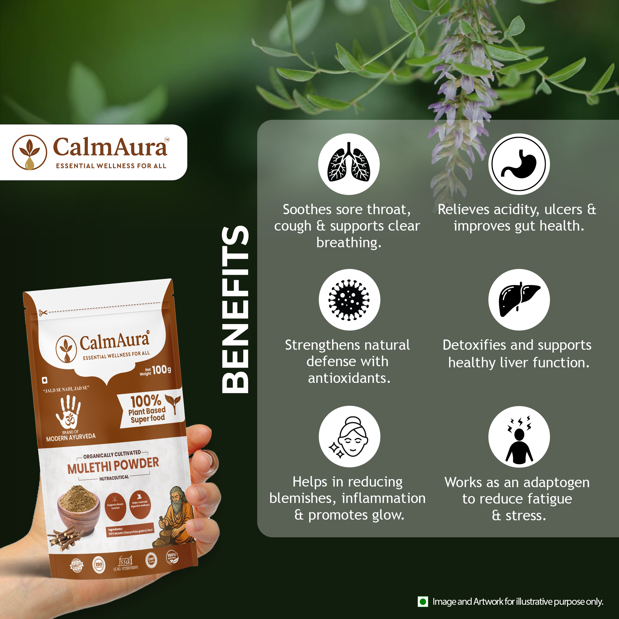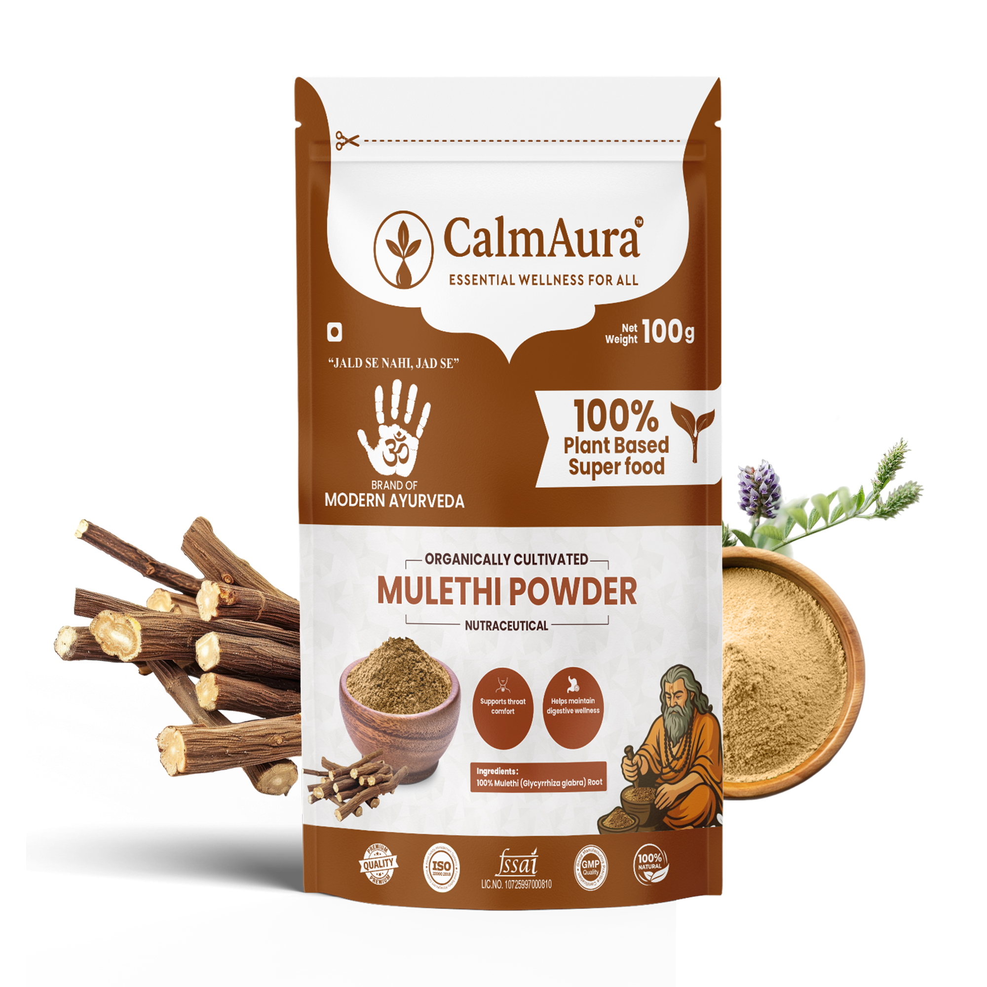 CalmAura Mulethi Root Powder is a natural Ayurvedic herb for throat, lung, and digestive wellness.