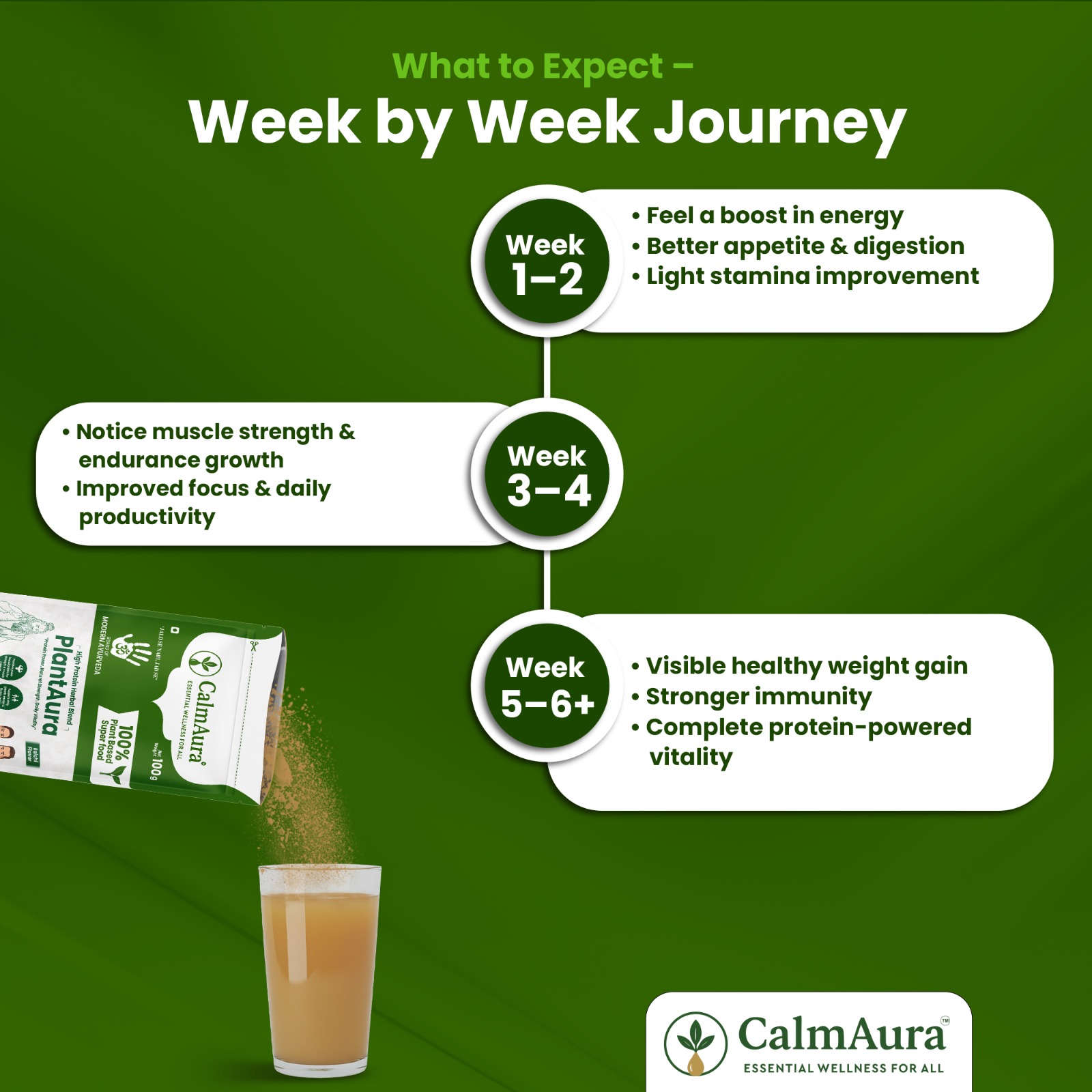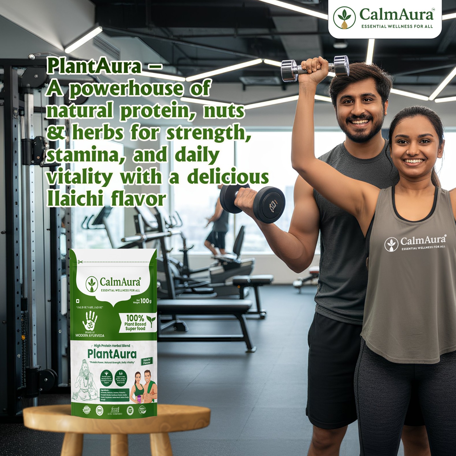 CalmAura PlantAura is a high-protein Ayurvedic superfood blend that provides complete plant-based nutrition for strength, stamina, and daily energy.
