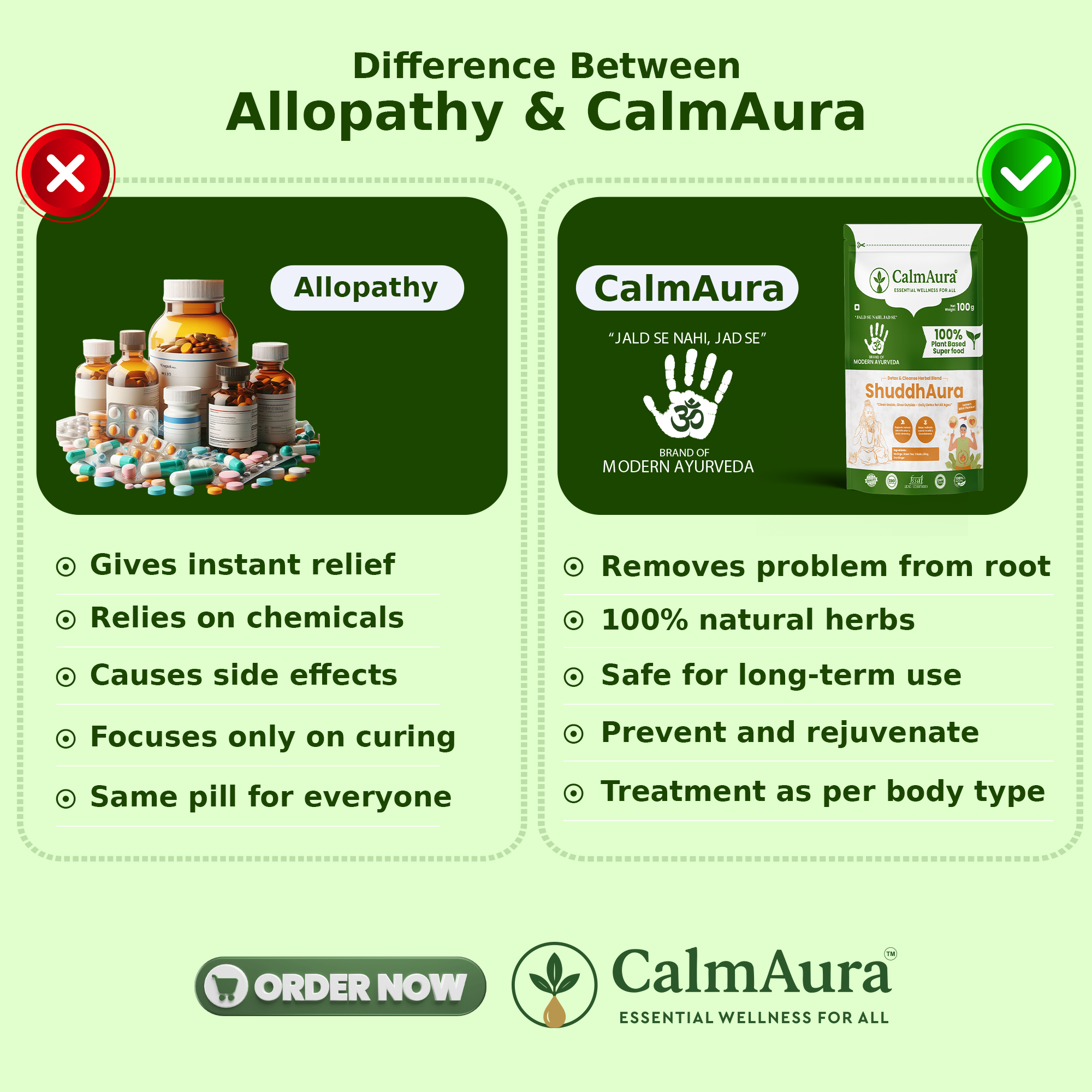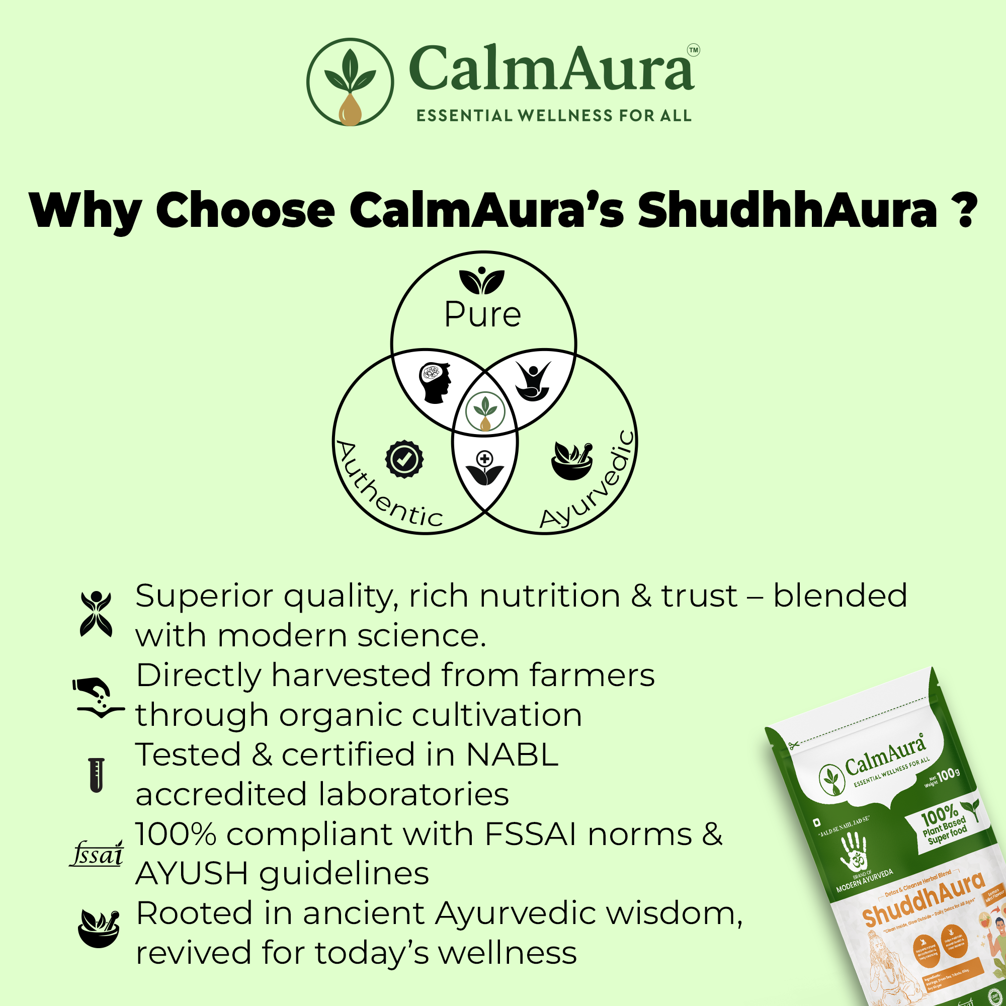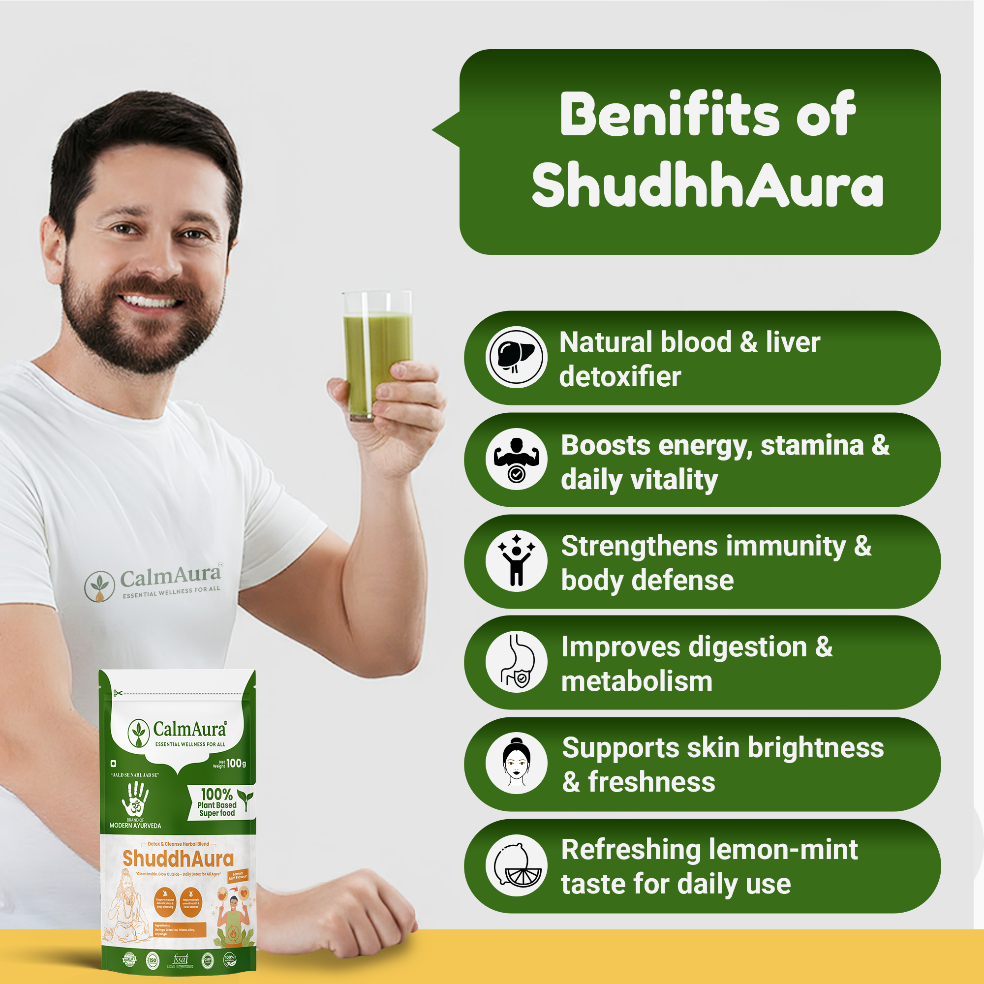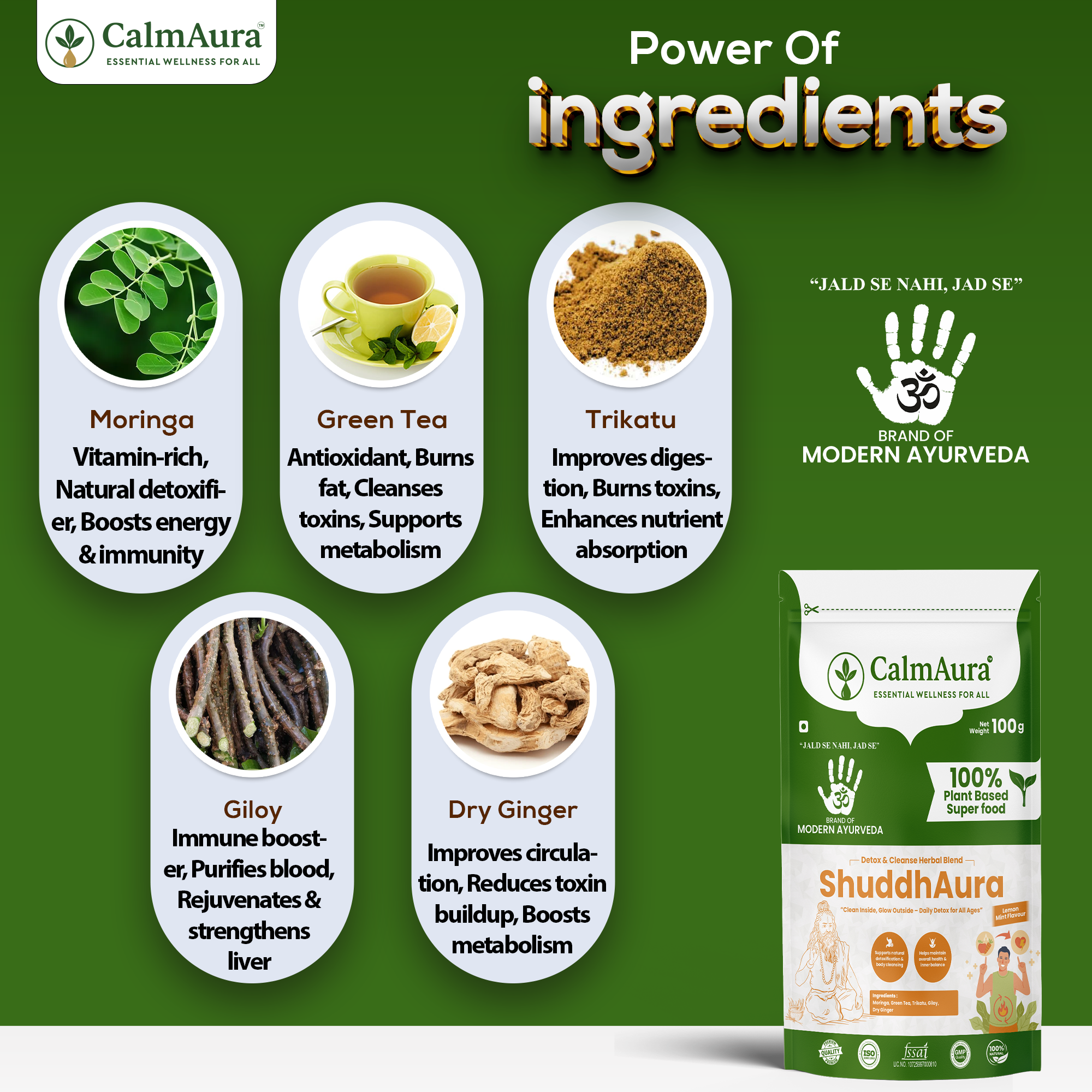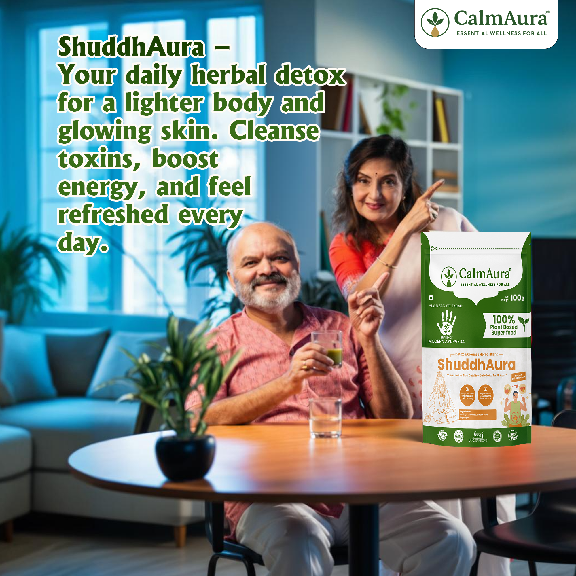 CalmAura ShuddhAura is a refreshing Ayurvedic detox and cleansing blend that gently purifies the body from within, supporting liver health, digestion, and radiant skin.