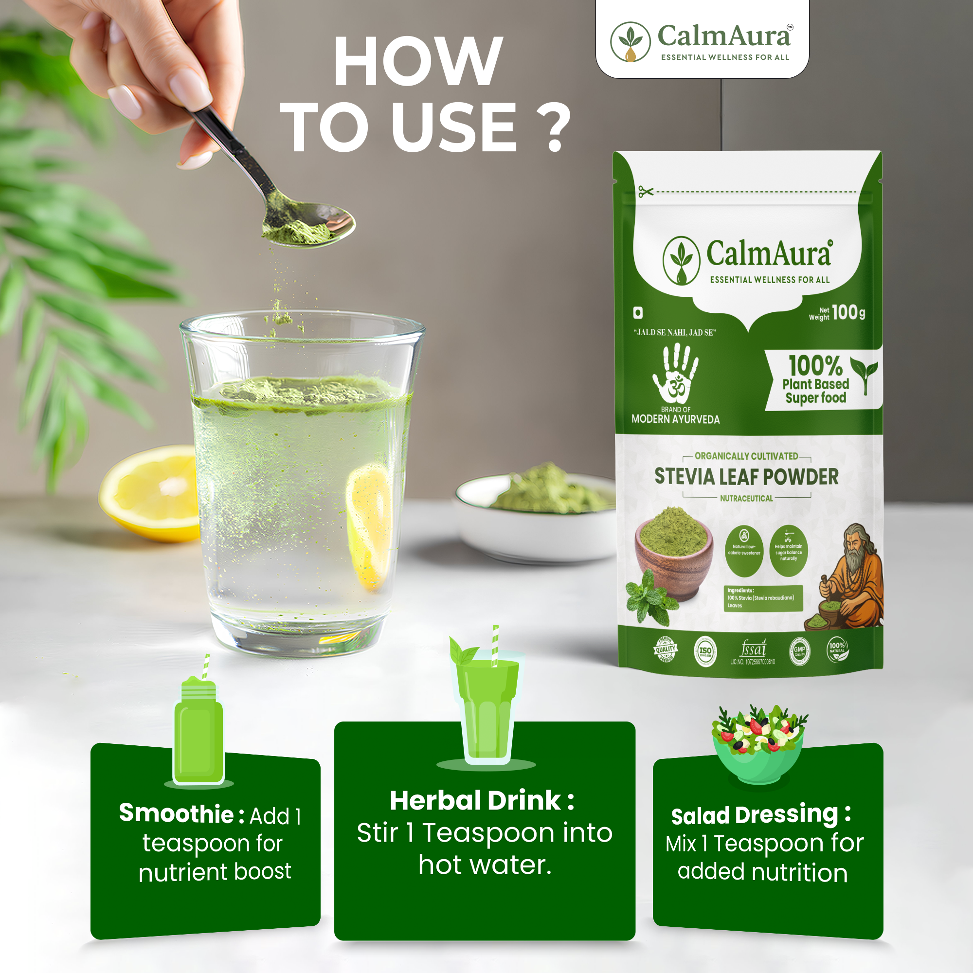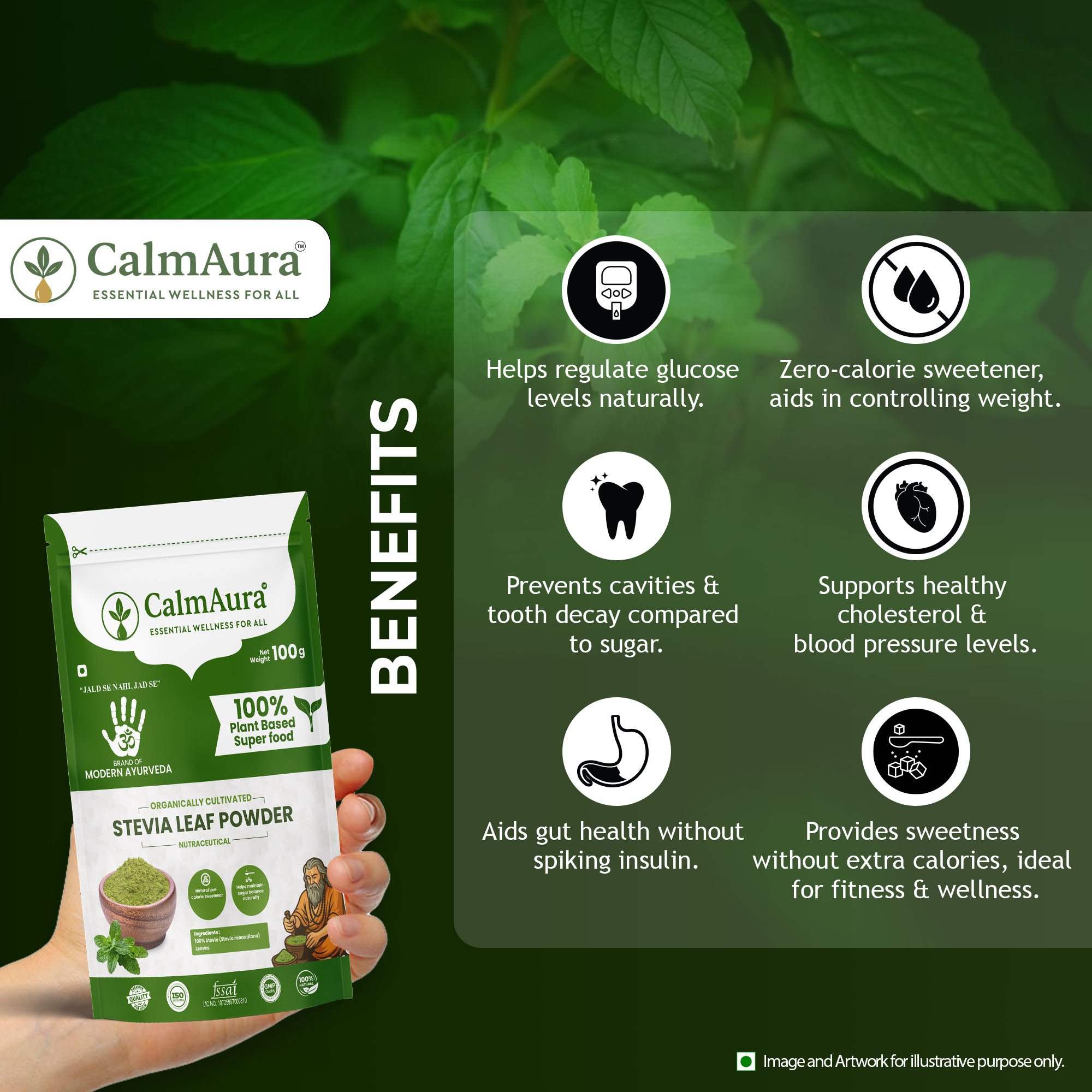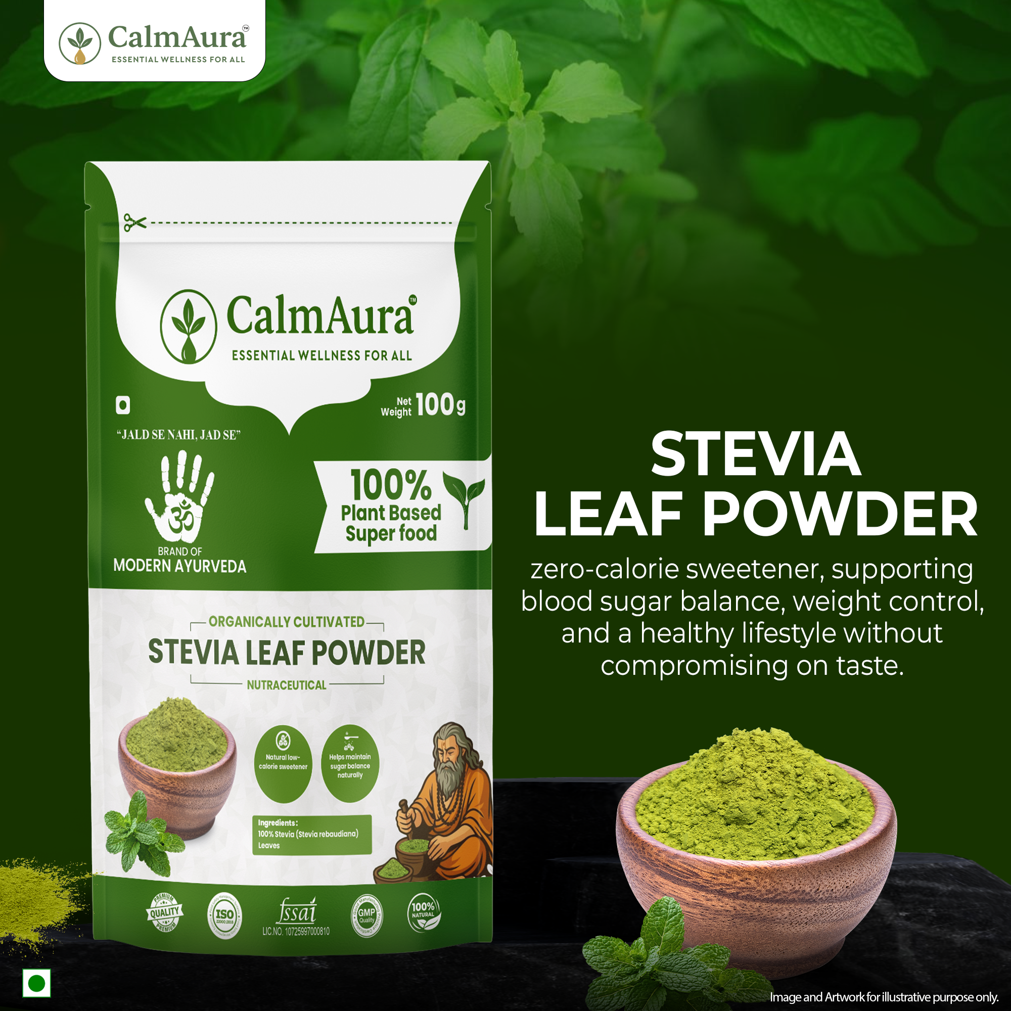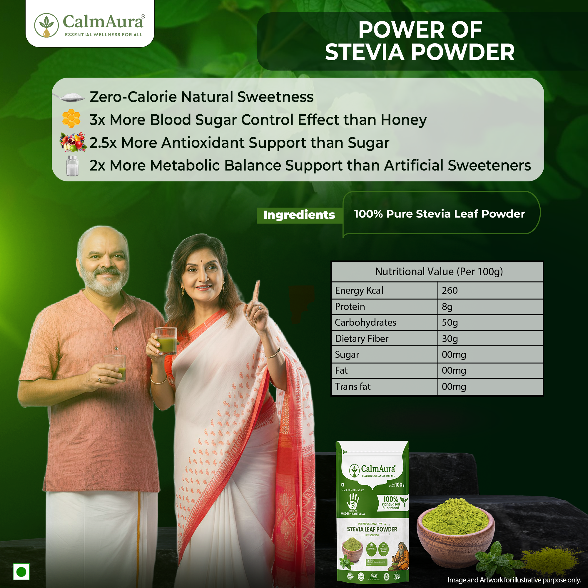 CalmAura Stevia Leaf Powder is a 100% natural, plant-based sugar substitute — zero calories, no chemicals, and safe for diabetics.