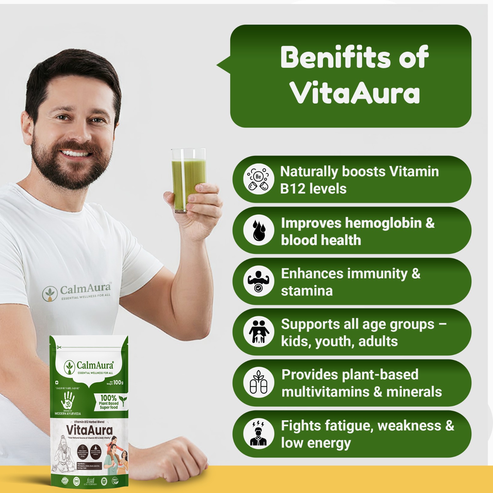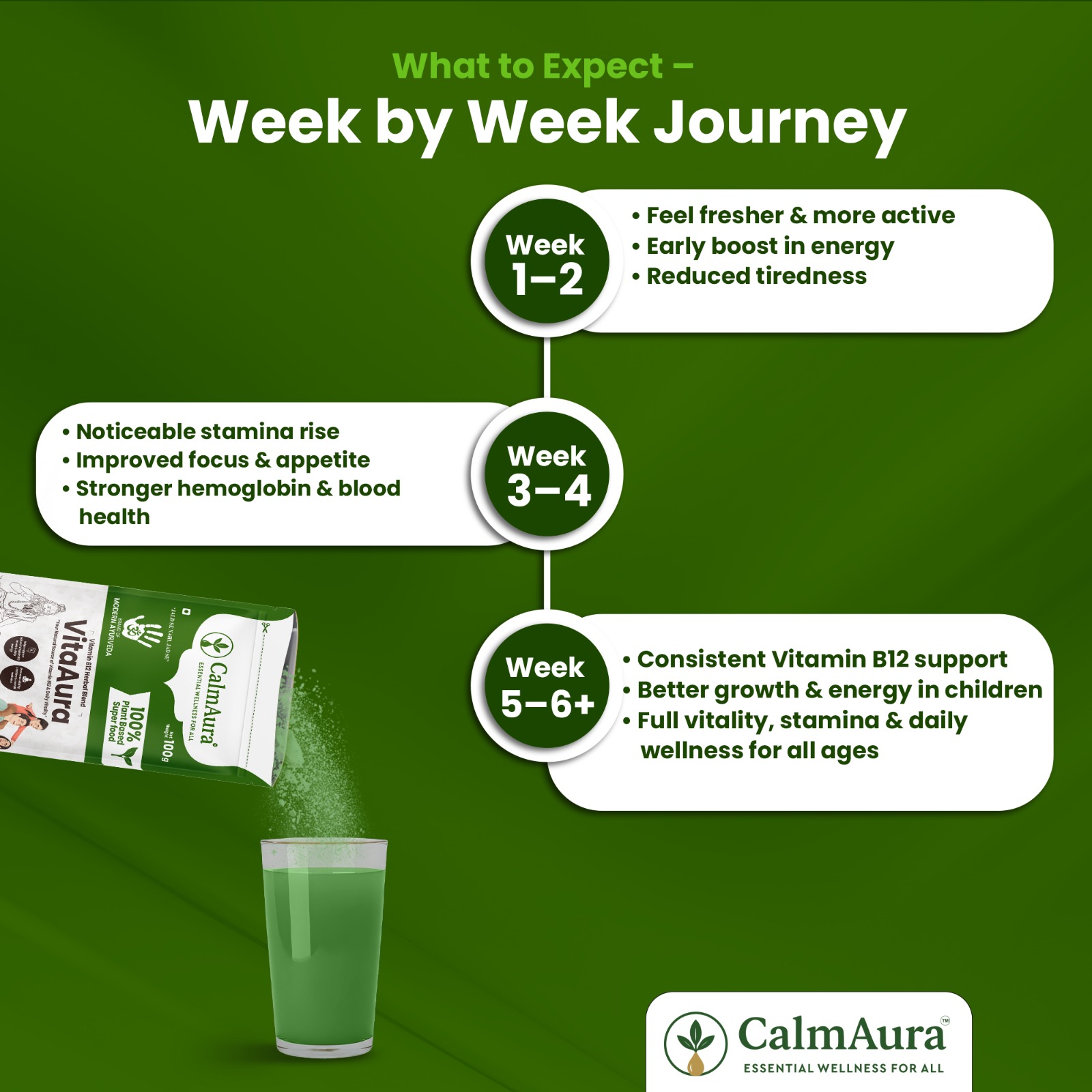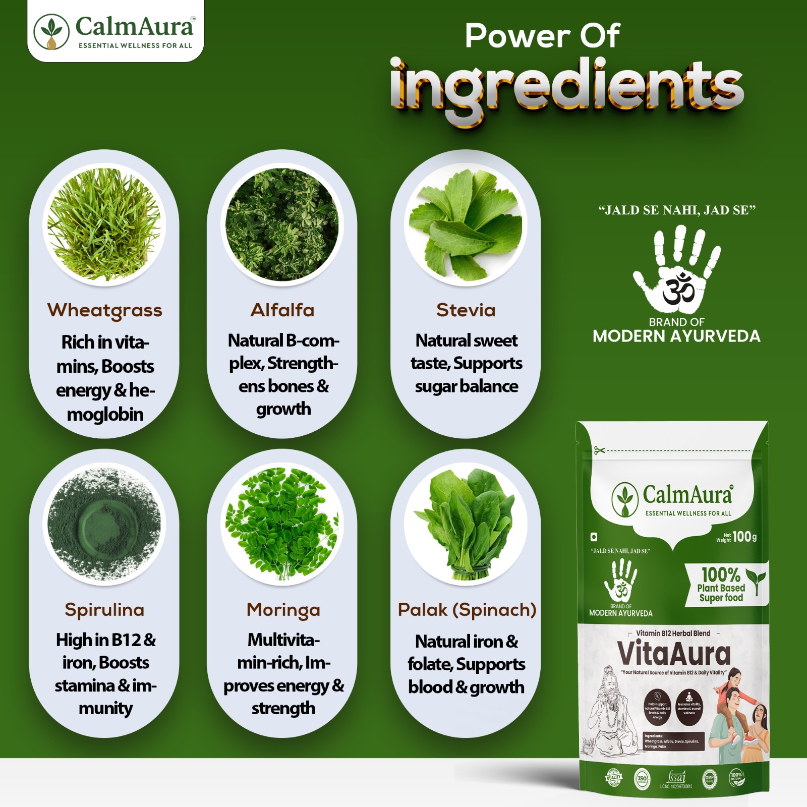 CalmAura VitaAura is a scientifically formulated Ayurvedic B12 & Multivitamin Herbal Blend that naturally boosts energy, improves blood health, and supports overall vitality for all age groups.